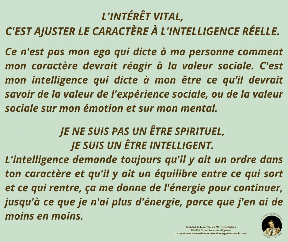 Bernard insiste sur l’importance de magnétiser l’énergie de l’intelligence afin qu’elle ajuste naturellement le caractère. Ce processus permet à l’homme de découvrir son intérêt vital, non par réflexion ou comparaison, mais par résonance directe avec son intelligence. Une fois cette harmonisation établie, le caractère cesse d’être une source de friction et devient un outil fonctionnel au service de l’intelligence.