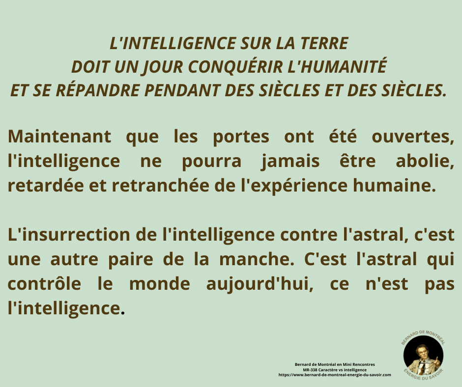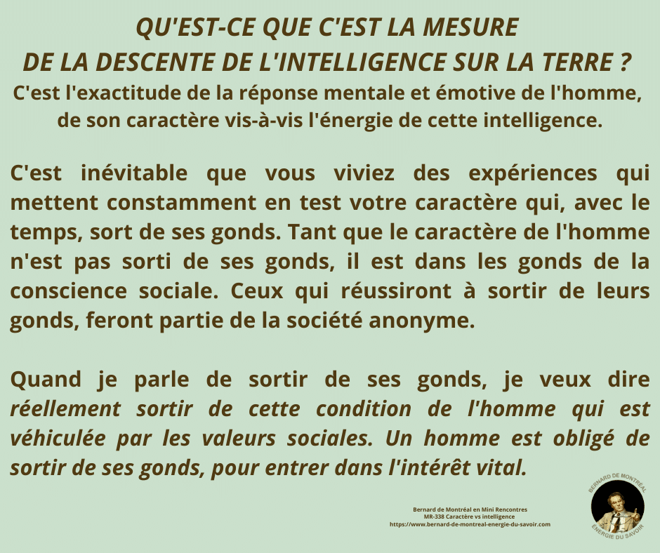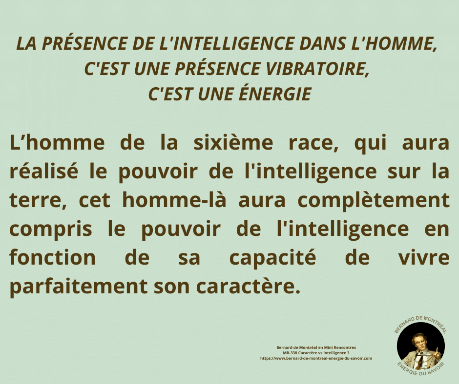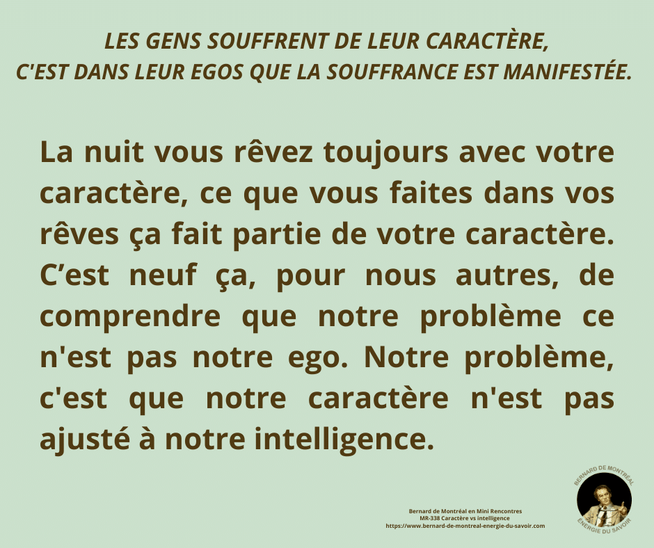 Bernard de Montréalexpose la distinction fondamentale entre le caractère et l’intelligence, et la nécessité de les harmoniser pour atteindre une véritable liberté intérieure. Le caractère appartient à la structure acquise de l’ego, façonnée par l’expérience, la mémoire et les conditionnements, tandis que l’intelligence est une énergie vibratoire indépendante de la personnalité.