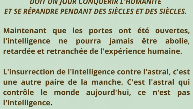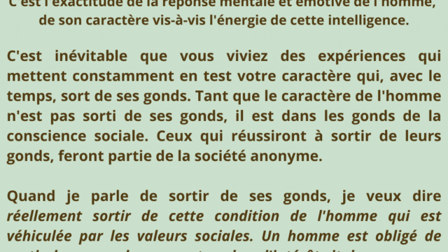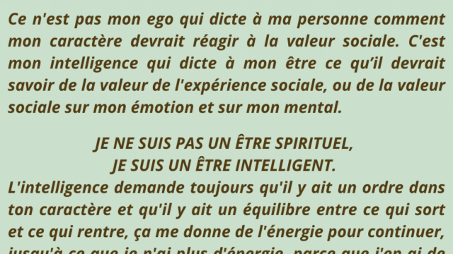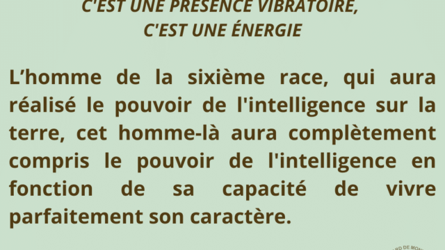 L’intelligence, en tant qu’énergie vibratoire, permet alors à l’homme de vivre pleinement, de manière équilibrée et autonome, sans être affecté par les influences extérieures ni par les pressions psychologiques du collectif.