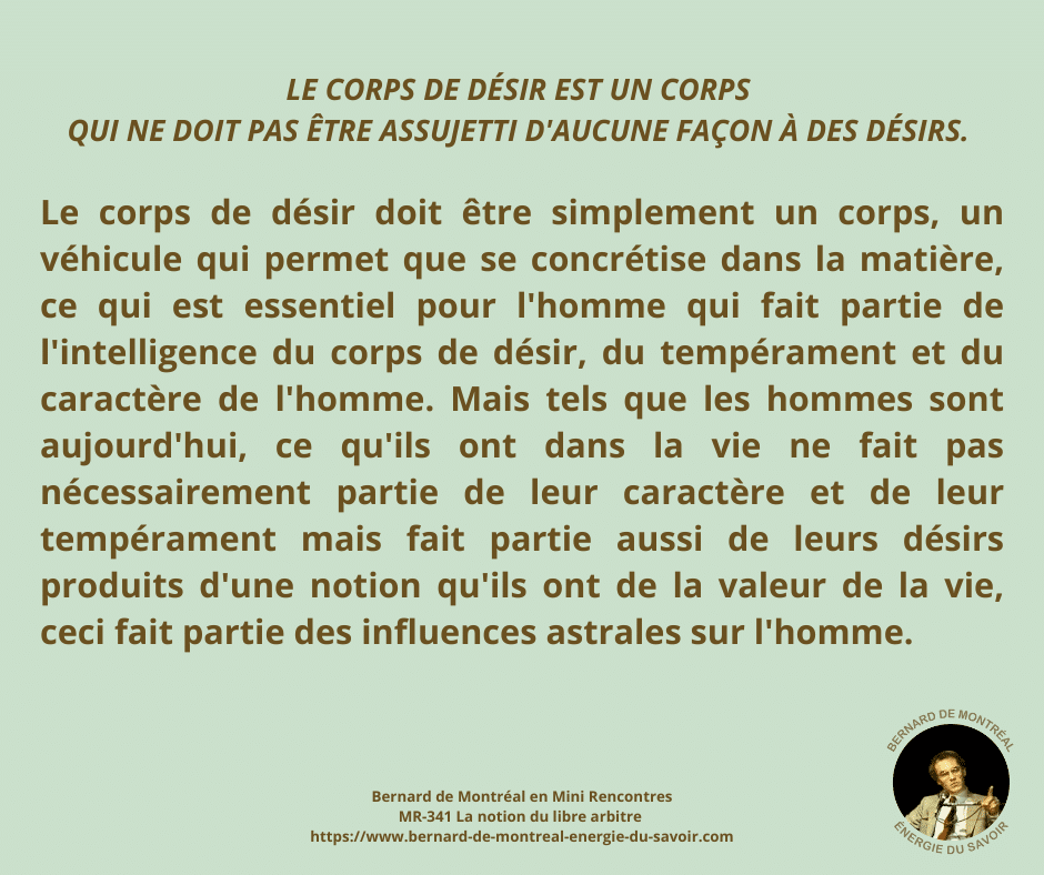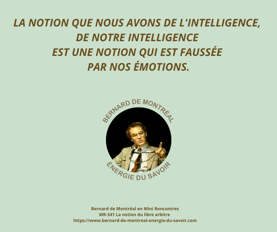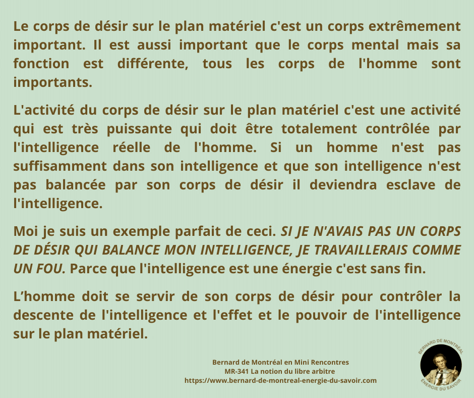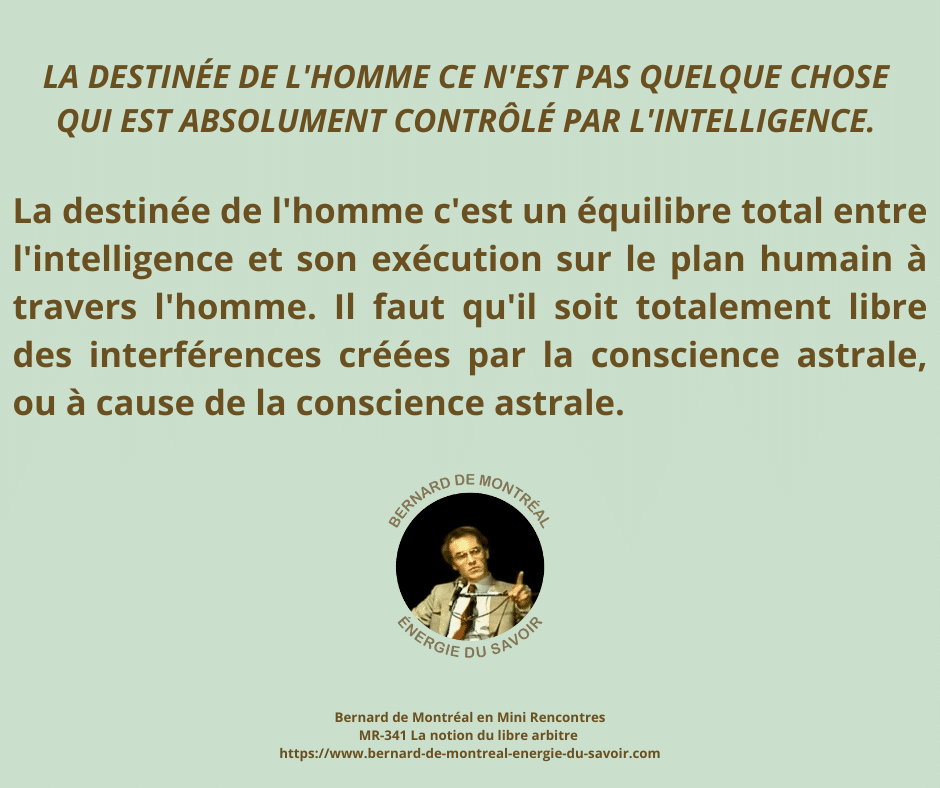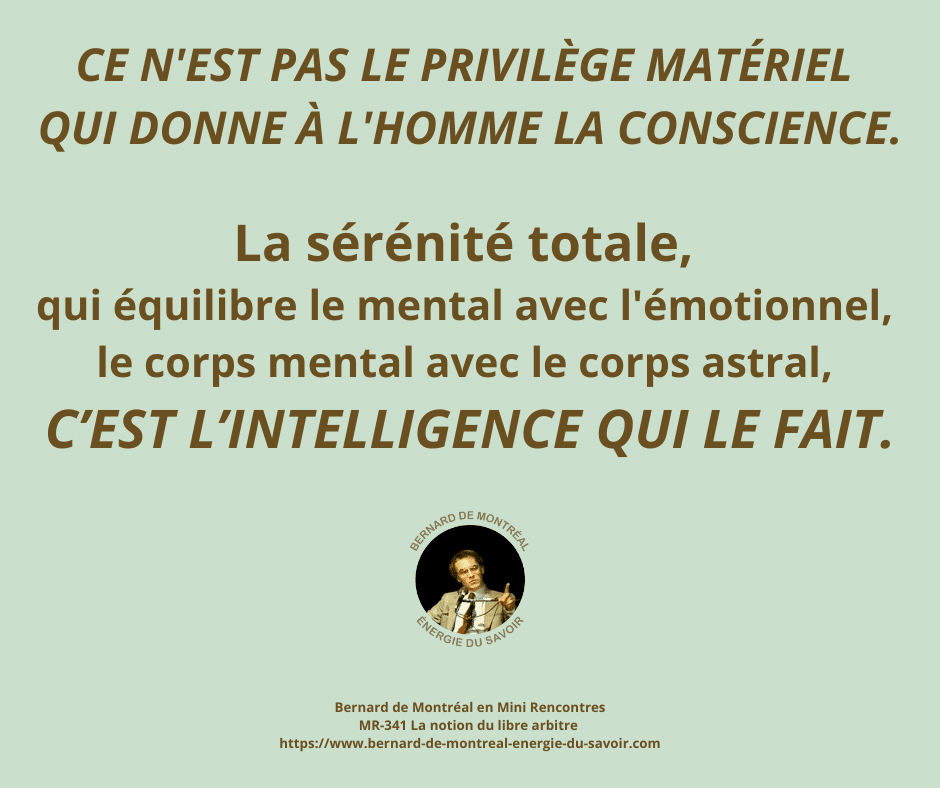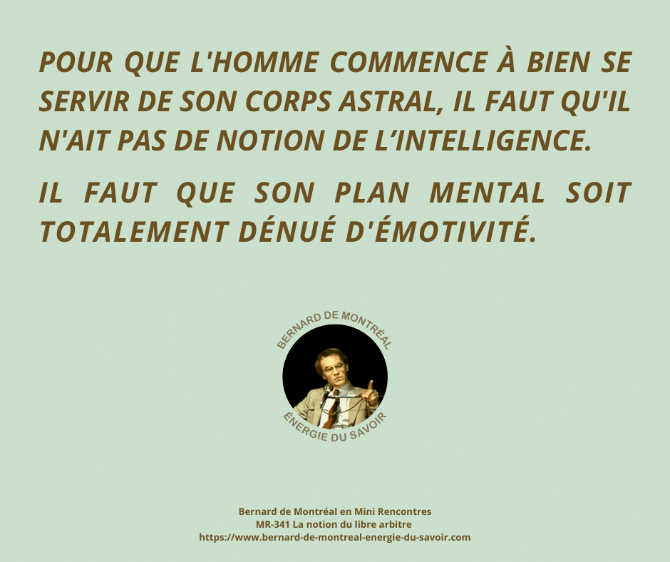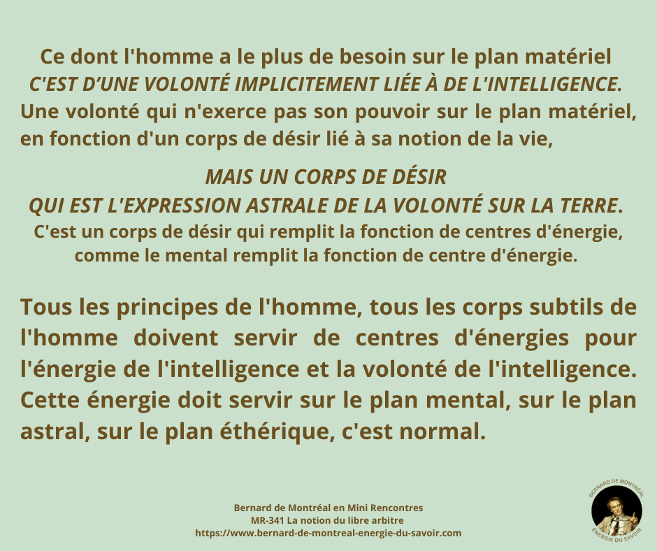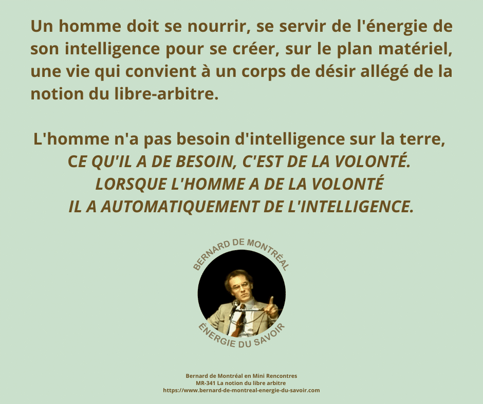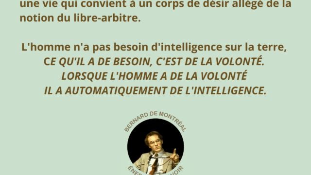 Bernard de Montréal aborde le libre arbitre comme une fonction vivante de l’intelligence appliquée à la structuration du corps de désir. Il précise que cette intelligence ne peut demeurer abstraite : elle doit irriguer la vie concrète de l’homme pour que celui-ci cesse d’agir à partir de modèles déformés par l’émotion et par l’ego, et commence à se mouvoir selon ce qu’il est réellement, au-delà des images qu’il se fabrique de lui-même.