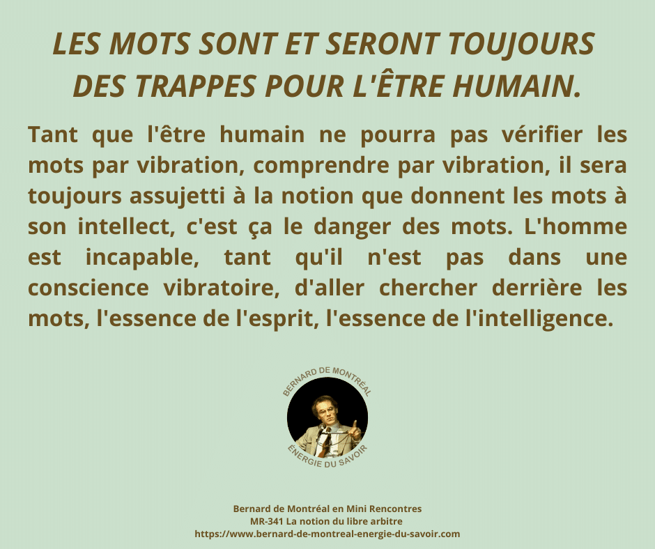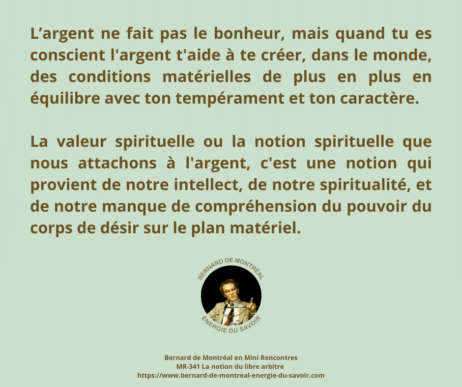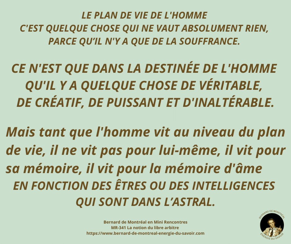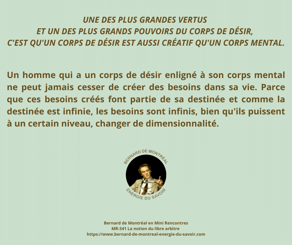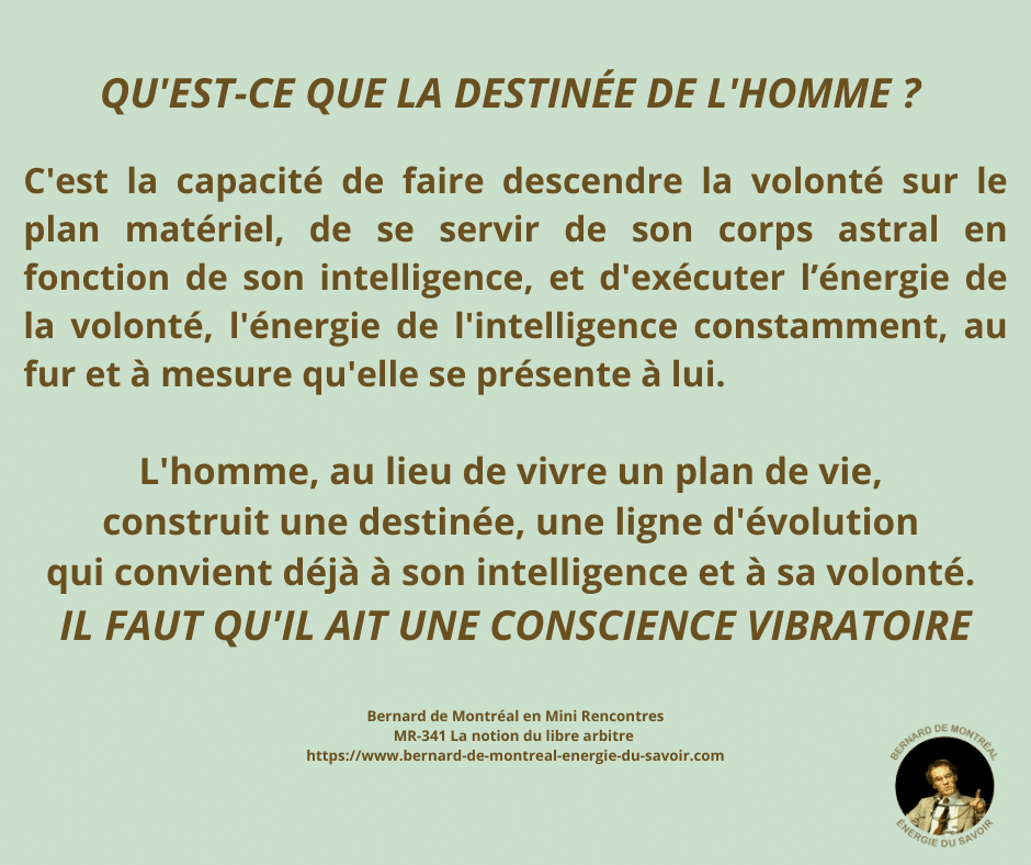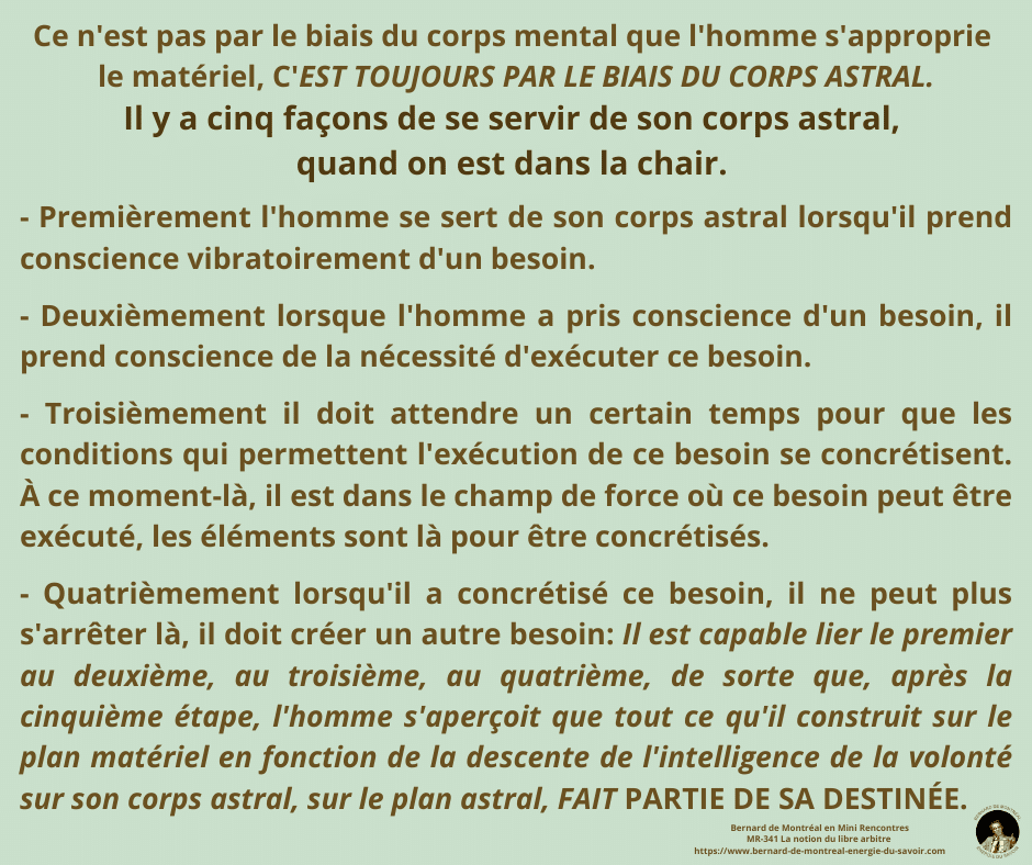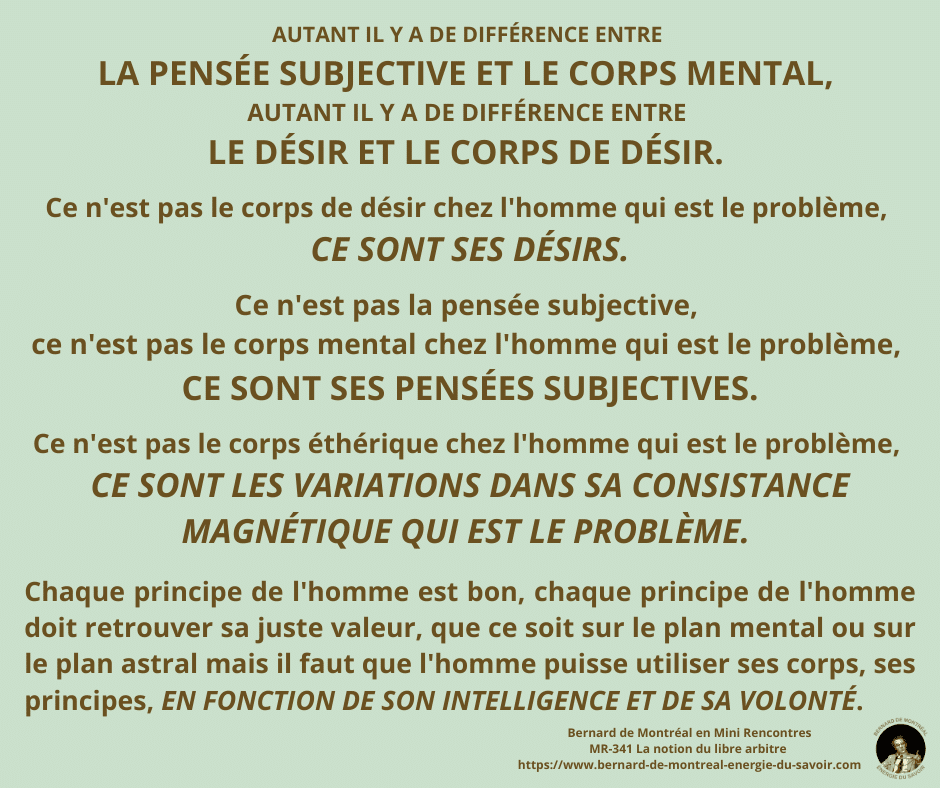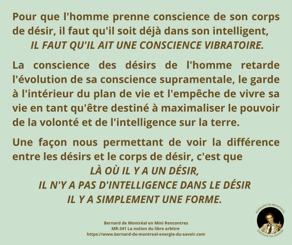 Bernard de Montréal aborde le libre arbitre comme une fonction vivante de l’intelligence appliquée à la structuration du corps de désir. Il précise que cette intelligence ne peut demeurer abstraite : elle doit irriguer la vie concrète de l’homme pour que celui-ci cesse d’agir à partir de modèles déformés par l’émotion et par l’ego, et commence à se mouvoir selon ce qu’il est réellement, au-delà des images qu’il se fabrique de lui-même.