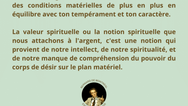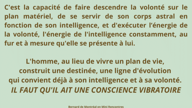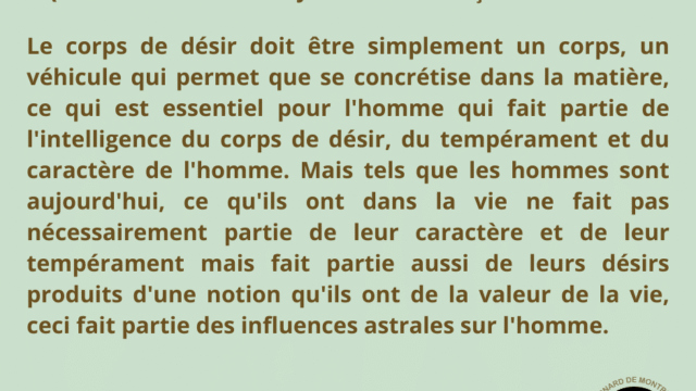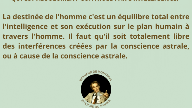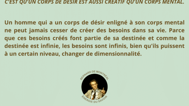 Bernard de Montréal nous explique que l’intelligence doit nourrir le corps de désir pour que l’homme puisse vivre une vie conforme à son véritable soi-même, plutôt qu’à des notions faussées par les émotions et l’ego. Il souligne l’importance de la volonté sur l’intelligence, affirmant que la volonté est essentielle pour créer une vie matérielle équilibrée. ll met en garde contre les interférences astrales et insiste sur la nécessité d’une conscience vibratoire pour aligner le corps de désir avec le corps mental. L’homme doit vivre de son corps de désir, non de ses désirs, pour atteindre une destinée véritable et éviter la souffrance.