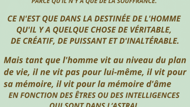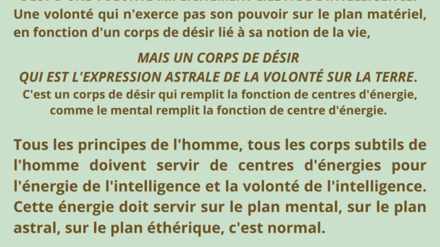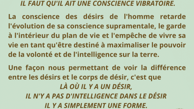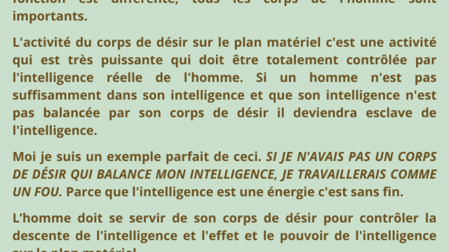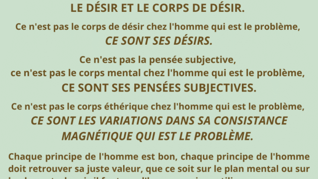 Il conclut que l’homme véritable ne vit pas de ses désirs, mais de son corps de désir clarifié, devenu transparent à l’intelligence et soutenu par une volonté ferme. C’est dans cette condition seulement que s’installe une destinée authentique, affranchie de la souffrance issue des illusions, des conflits internes et des dérives de l’ego.
