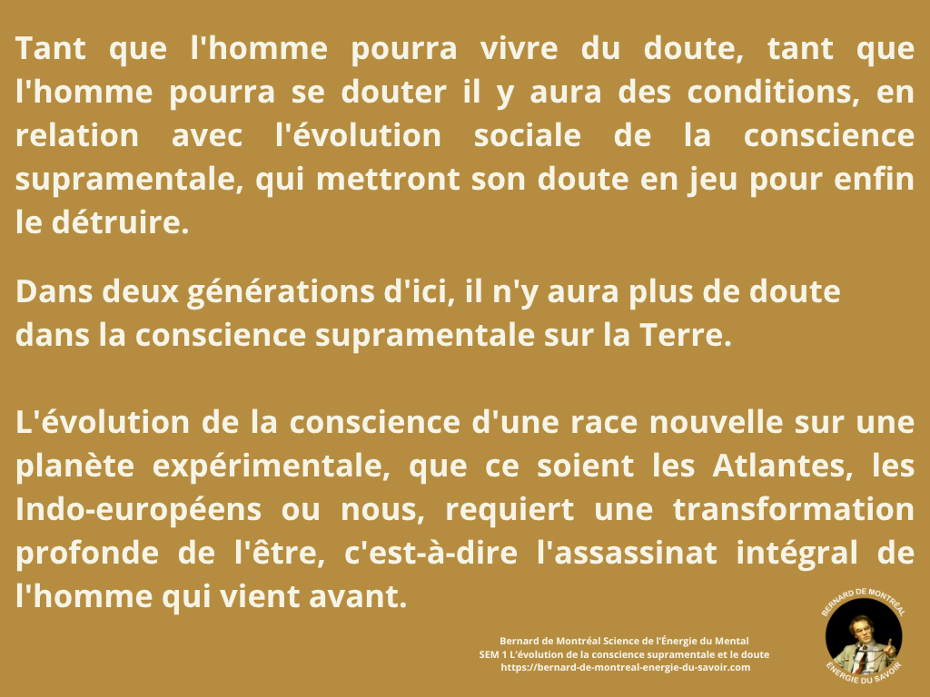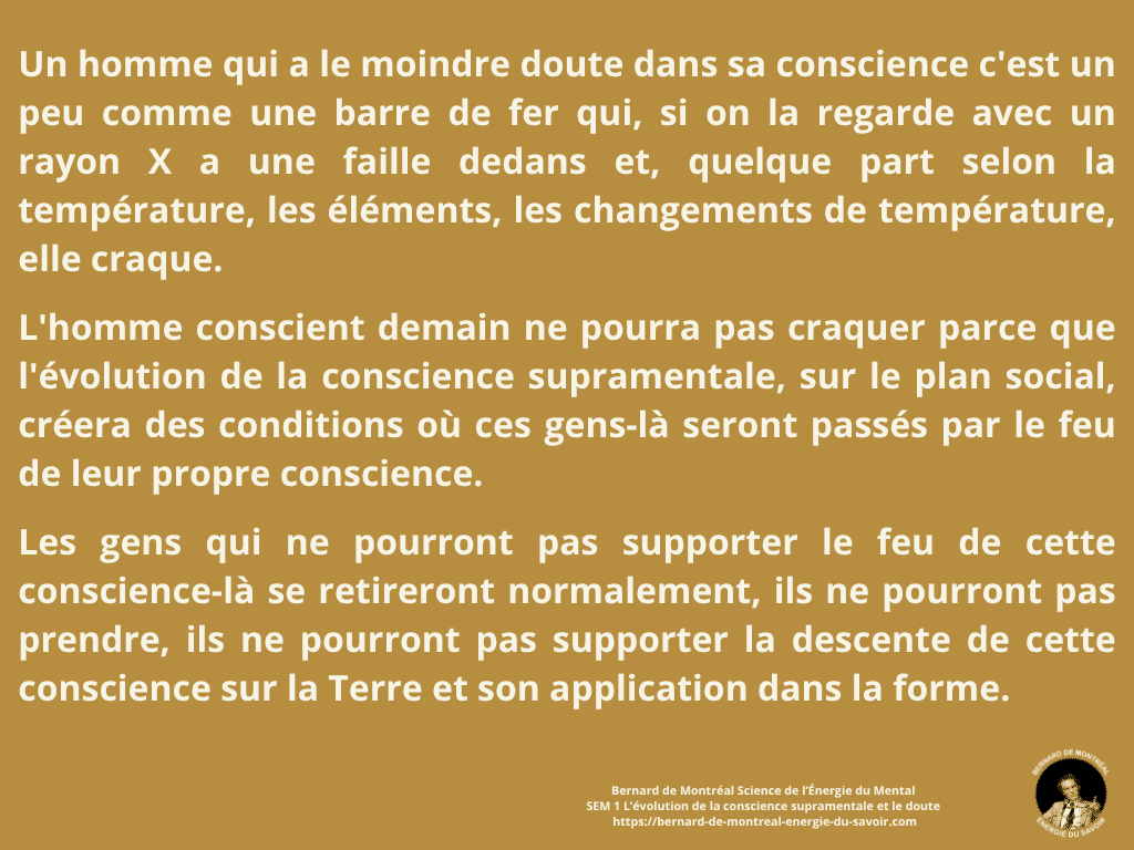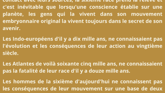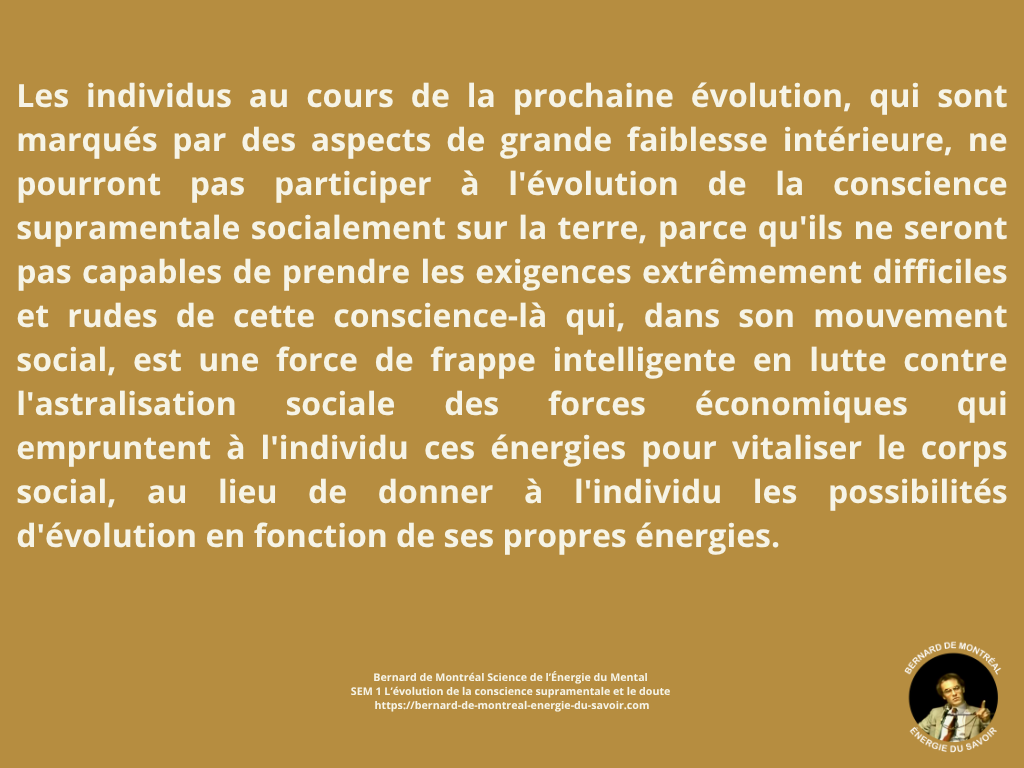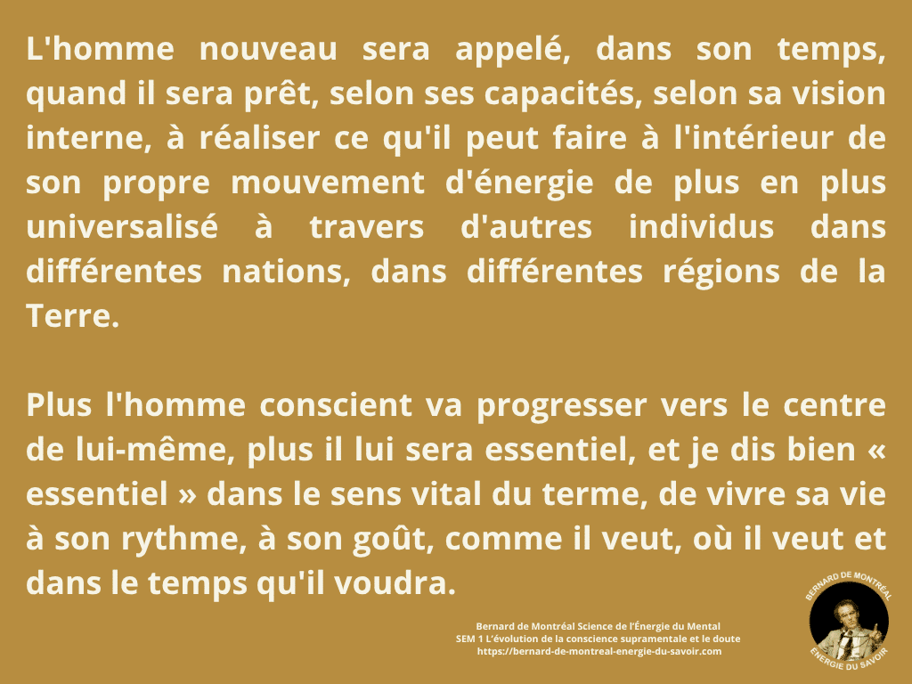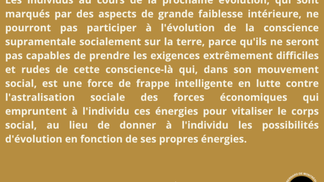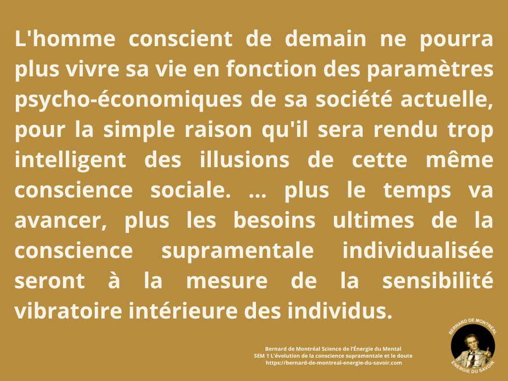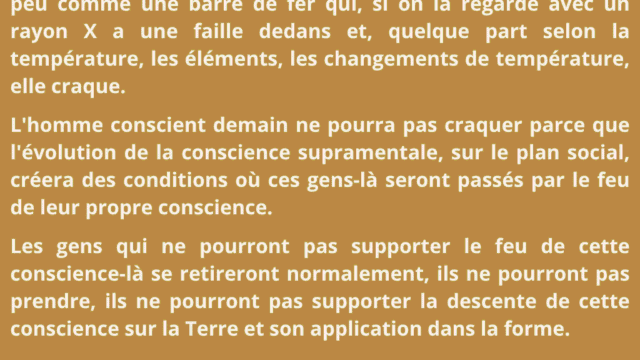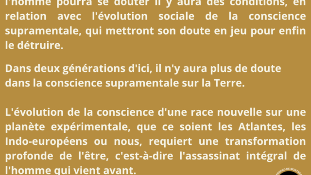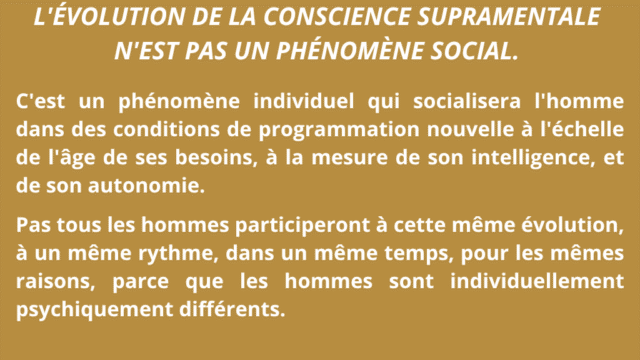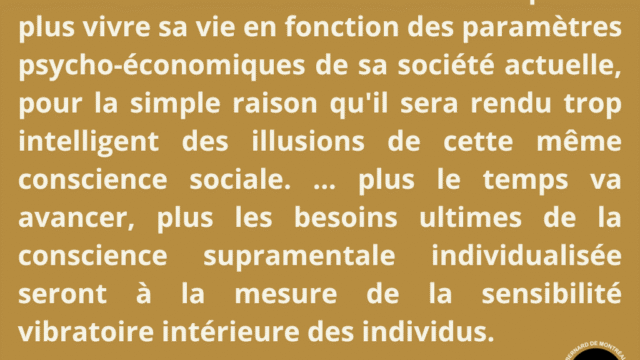 Ainsi, la conscience supramentale ne vise pas une amélioration de l’homme ancien, mais la naissance d’unhomme intérieur nouveau, capable de vivre selon sa propre loi énergétique. De cette mutation individuelle découlera naturellement une civilisation affranchie des structures actuelles, non par révolution, mais par dépassement.