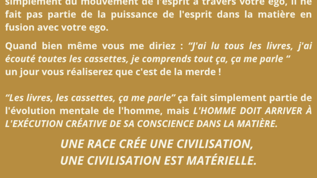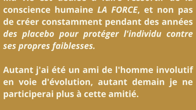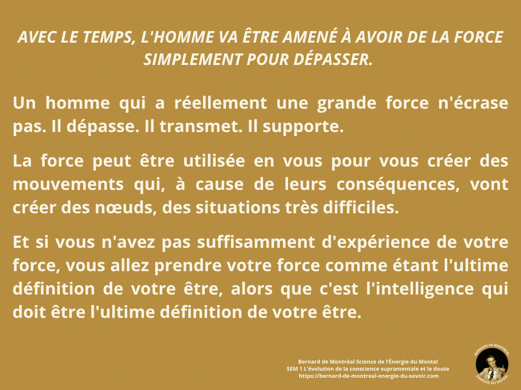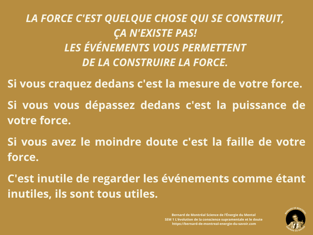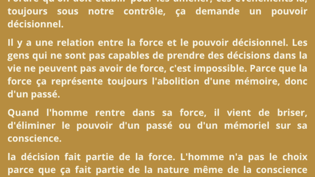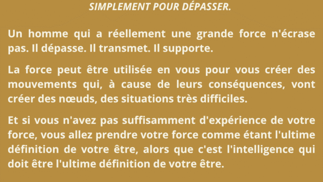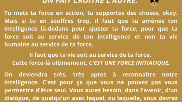 Cette mutation repose sur une force intérieure réelle, qui ne peut être ni transmise ni empruntée. Elle se construit par la confrontation avec l’ego, par la reconnaissance des illusions et par la capacité à ne plus être affecté par les pressions psychologiques ou sociales. Sans cette force, l’homme reste dépendant de ses réactions, de ses peurs et de ses conditionnements.