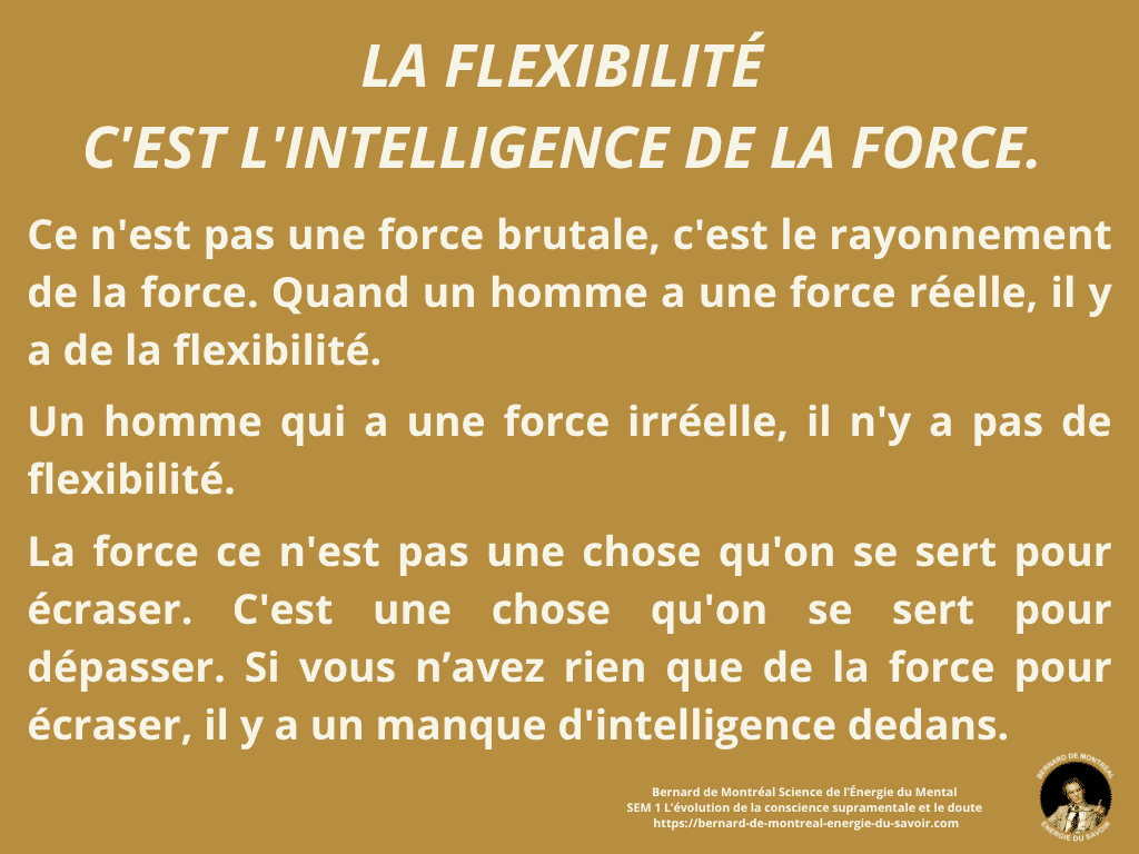 Cependant, cette force ne peut exister sans flexibilité, qui en est l’intelligence active. Une force rigide renforce l’ego, tandis qu’une force intelligente permet de traverser, d’ajuster et de transmettre sans opposition. C’est cette alliance qui donne à l’homme sa véritable capacité d’action.