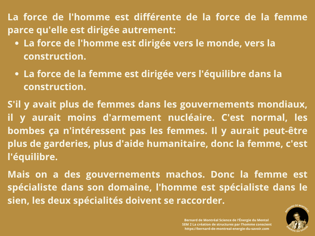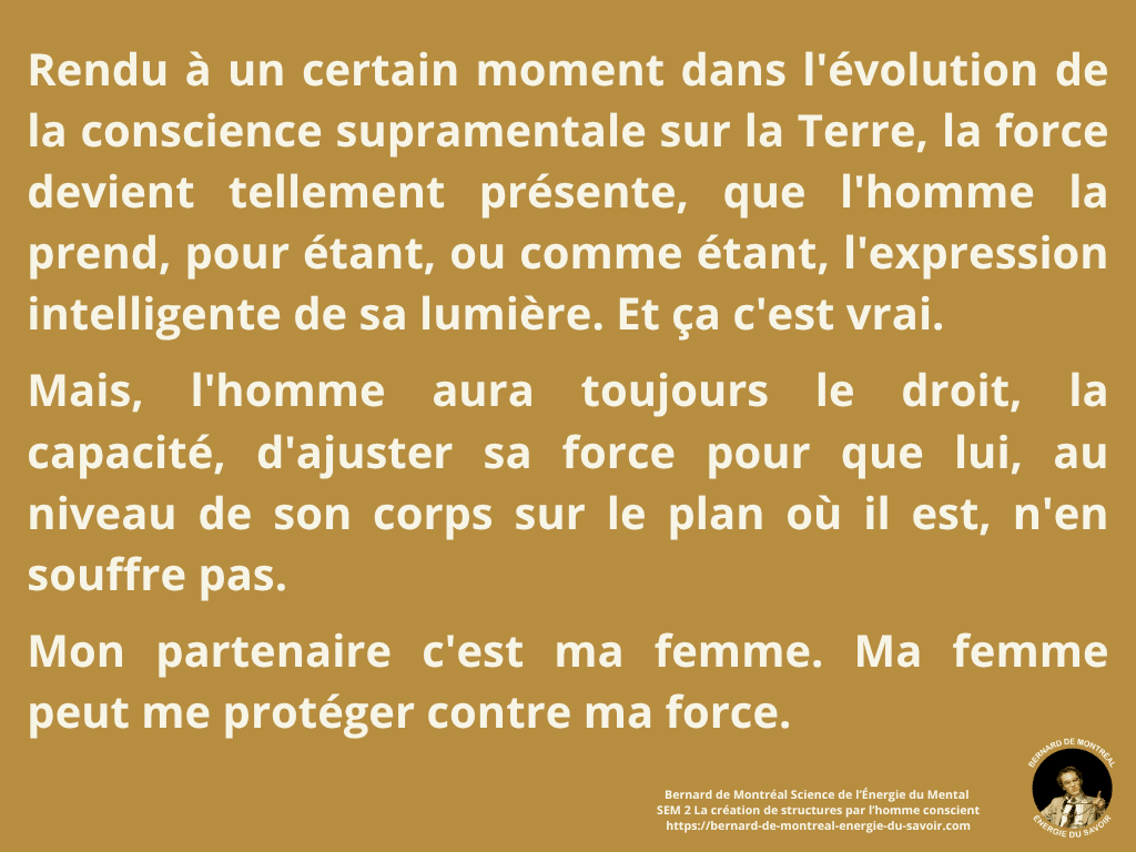 Ce séminaire met en évidence que l’homme conscient ne peut soutenir seul l’intensité de sa propre énergie. La relation devient alors un principe d’ajustement, non affectif mais vibratoire, où le partenaire stabilise, canalise et équilibre la force créative. L’homme oriente la construction, la femme en régule l’équilibre, non comme rôles psychologiques, mais comme fonctions énergétiques complémentaires nécessaires à la justesse de l’action.