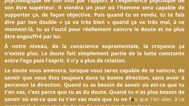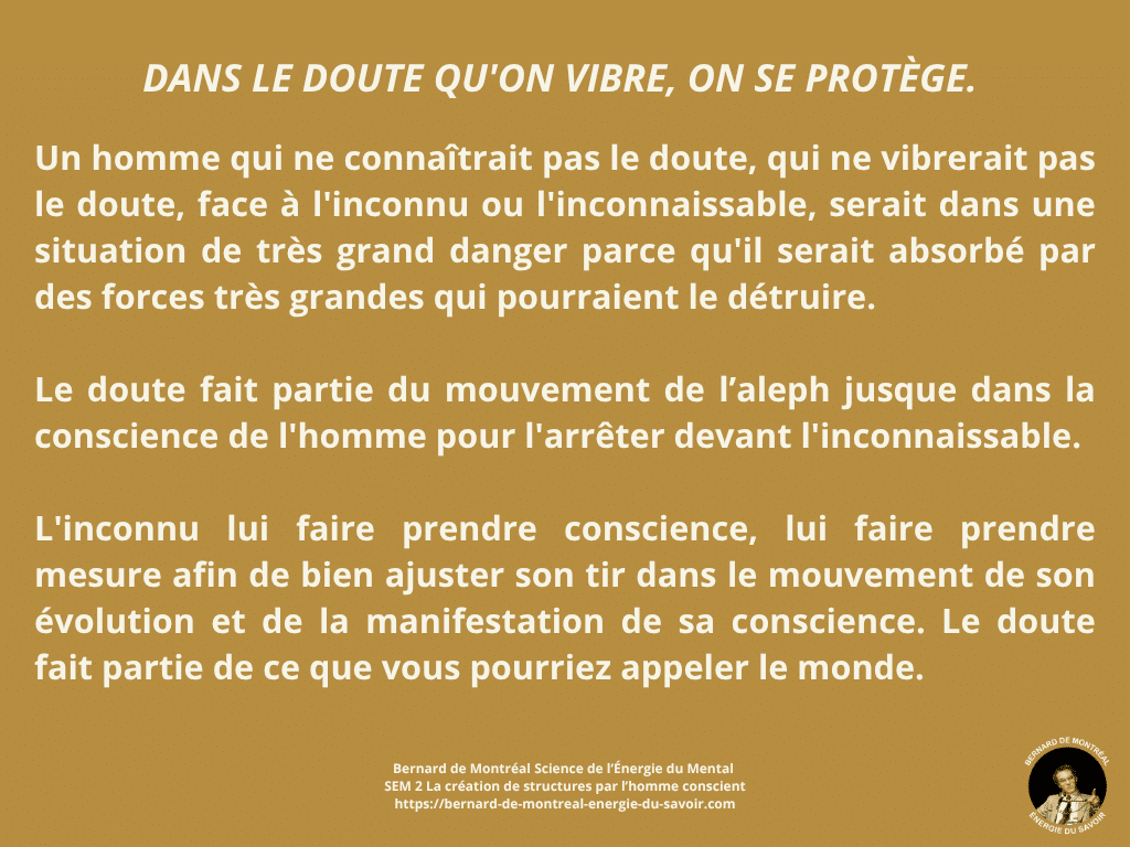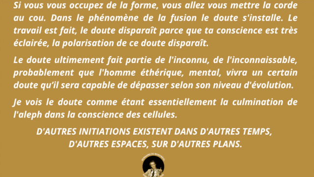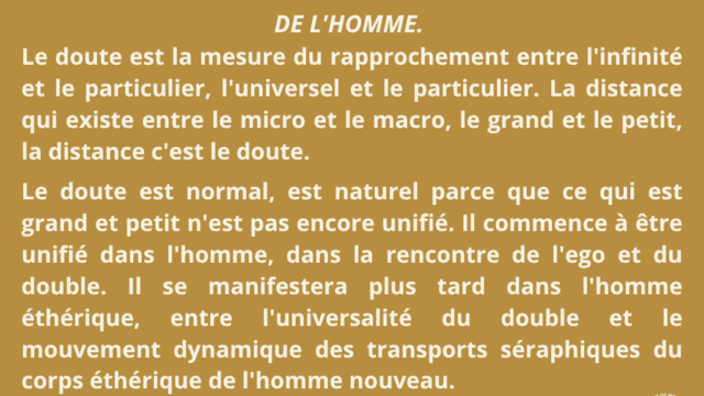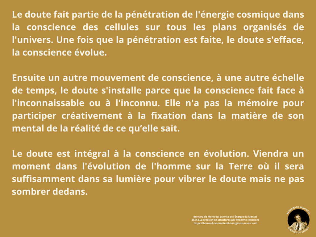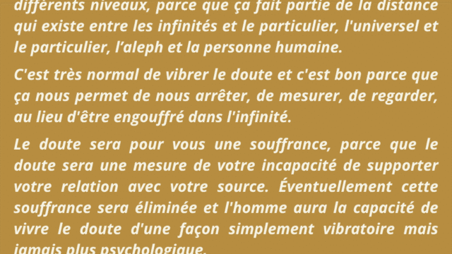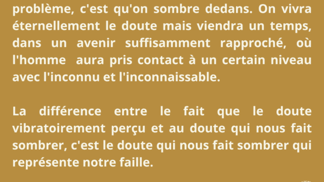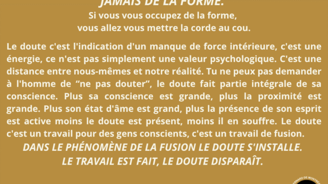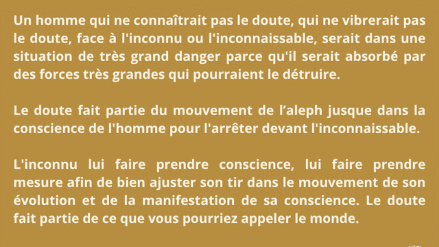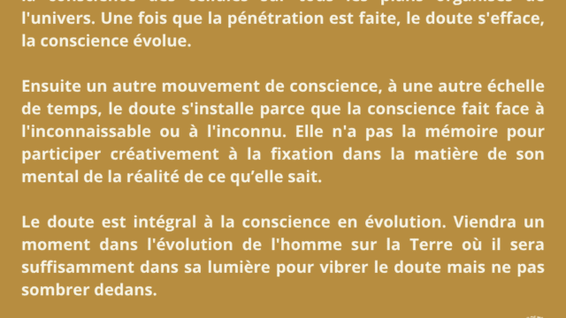 Le doute, dans cette dynamique, n’est pas éliminé mais compris dans sa nature. Il existe un doute vibratoire, qui protège et maintient l’ajustement entre l’homme et le réel, et un doute psychologique, qui divise et affaiblit. L’évolution consiste à ne plus être affecté par ce dernier, tout en laissant le premier jouer son rôle d’équilibrage dans l’intégration de l’infinité dans le particulier.