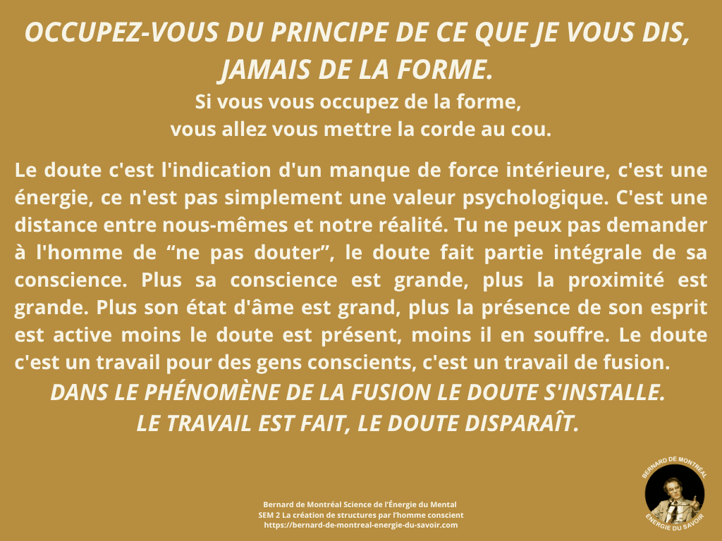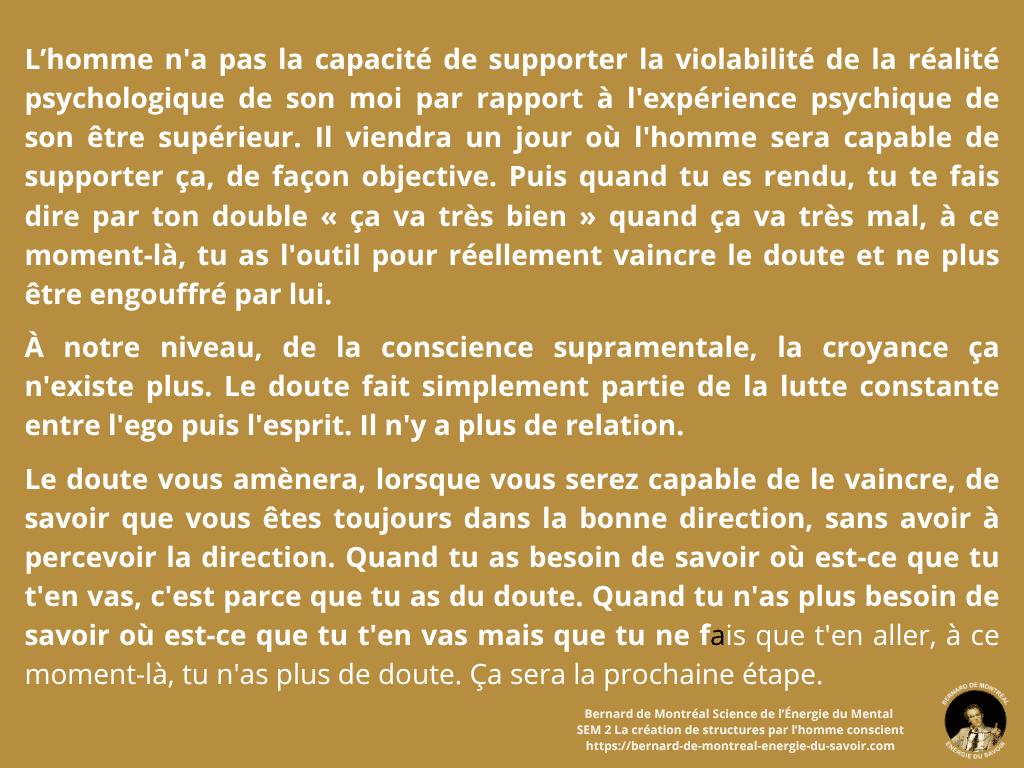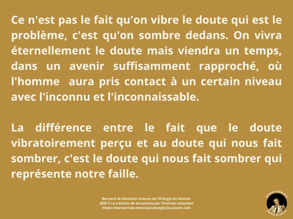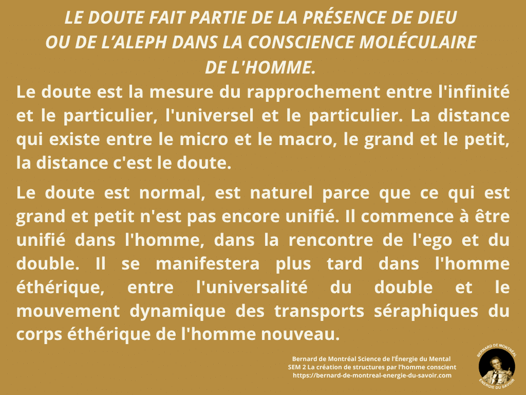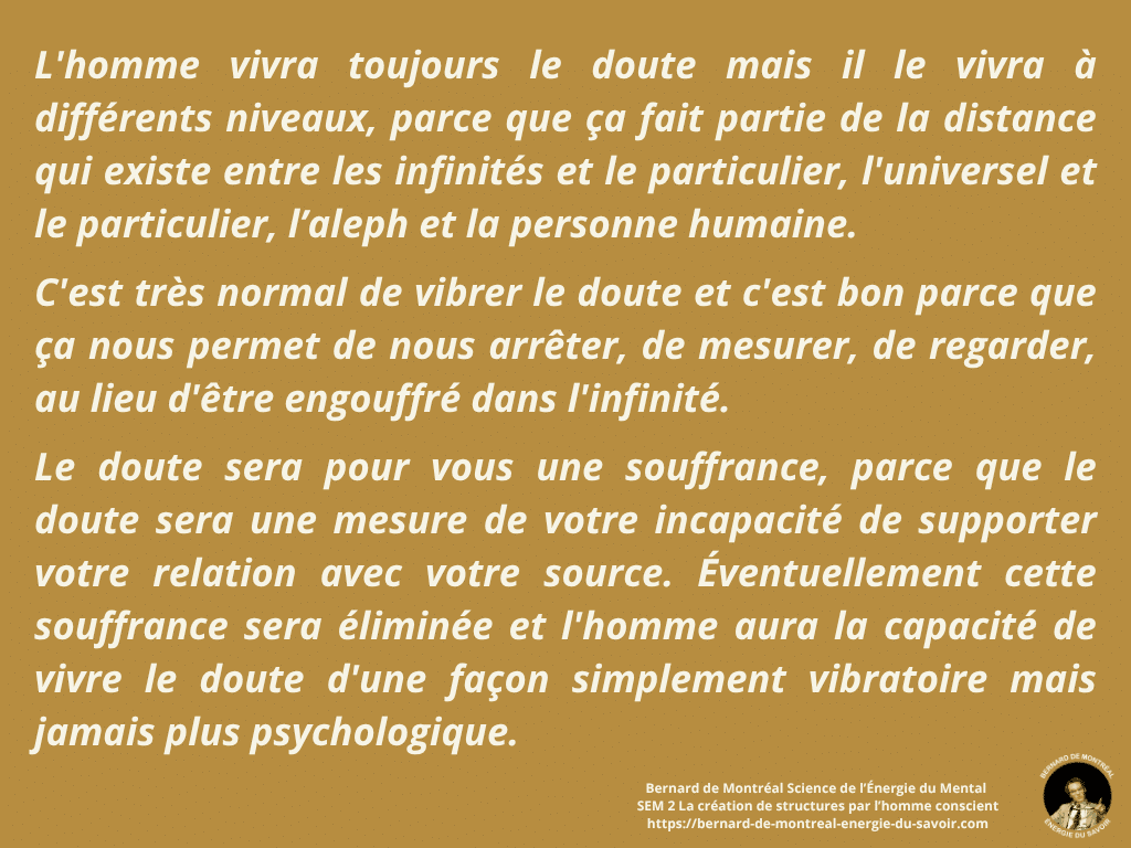 Le doute, dans cette dynamique, n’est pas éliminé mais compris dans sa nature. Il existe un doute vibratoire, qui protège et maintient l’ajustement entre l’homme et le réel, et un doute psychologique, qui divise et affaiblit. L’évolution consiste à ne plus être affecté par ce dernier, tout en laissant le premier jouer son rôle d’équilibrage dans l’intégration de l’infinité dans le particulier.