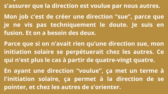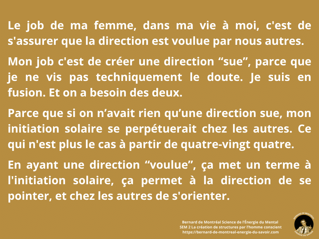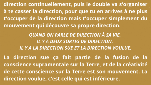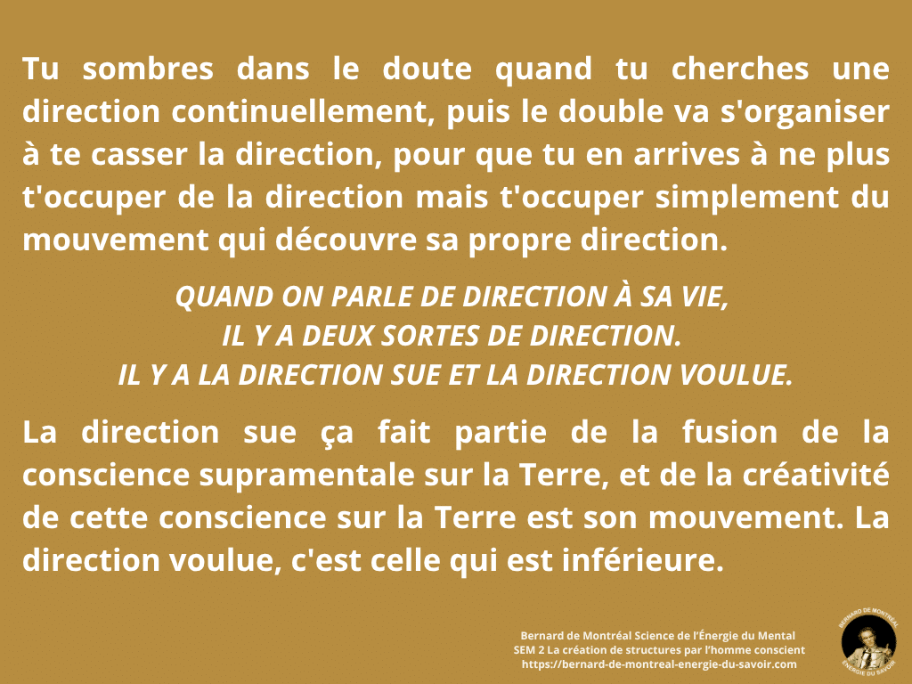 Cette création repose sur l’équilibre entre direction sue et direction voulue. La direction sue émerge de l’intelligence immédiate de l’énergie, sans interférence de l’ego. La direction voulue organise, structure et matérialise. Sans la première, l’action devient mécanique ; sans la seconde, elle reste sans forme. Leur union permet une manifestation juste et stable.
