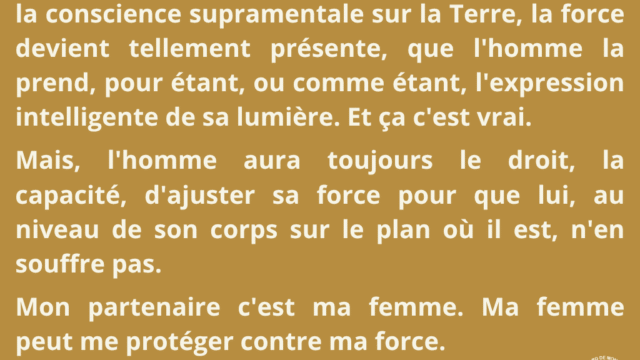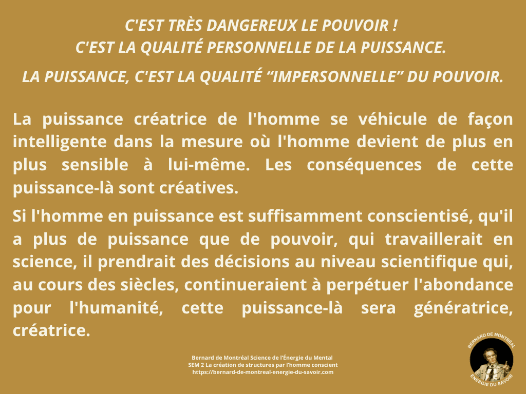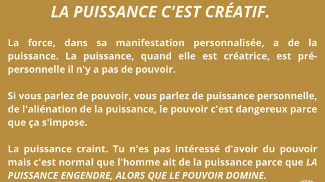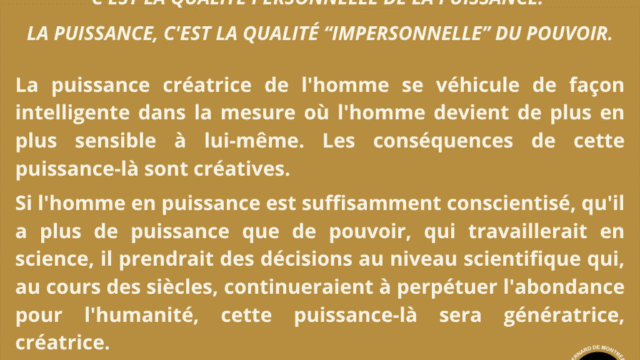 La distinction entre puissance et pouvoir est fondamentale. La puissance est impersonnelle, créative, issue de la connexion réelle à l’énergie du mental, tandis que le pouvoir relève de l’ego et cherche à dominer. Là où le pouvoir enferme et aliène, la puissance ouvre, engendre et structure sans appropriation. L’homme conscient doit donc apprendre à agir sans jamais retomber dans les mécanismes de contrôle.