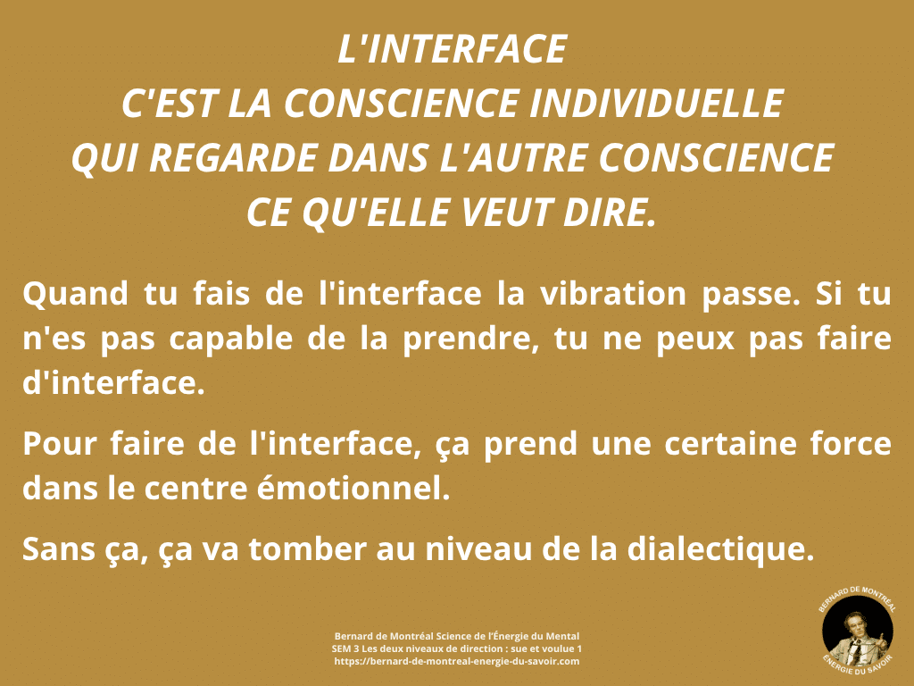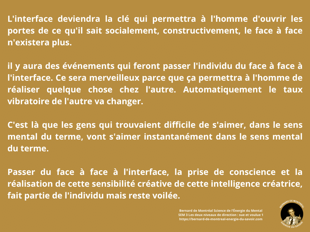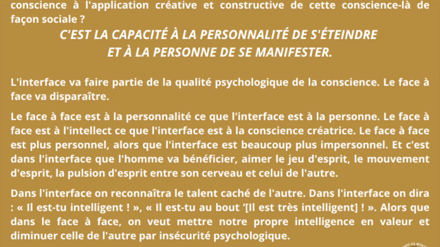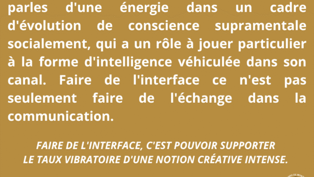 Cette dynamique s’inscrit dans l’évolution de la conscience supramentale, qui ne s’arrête pas à l’individu, mais cherche naturellement à se socialiser dans des formes relationnelles nouvelles. L’interface devient alors le mode de communication propre à cette mutation, remplaçant progressivement les rapports de force et les conflits issus des personnalités.