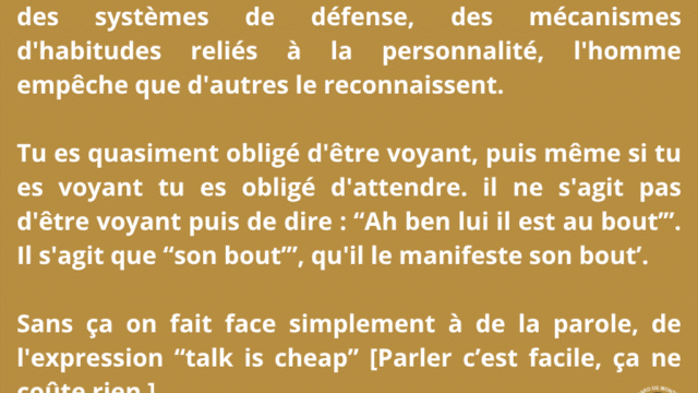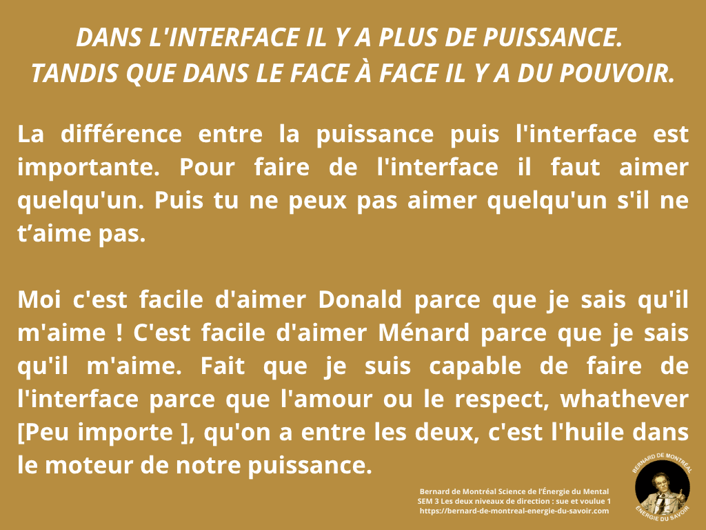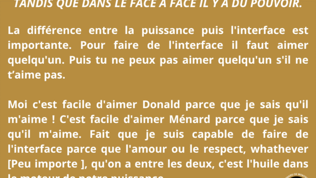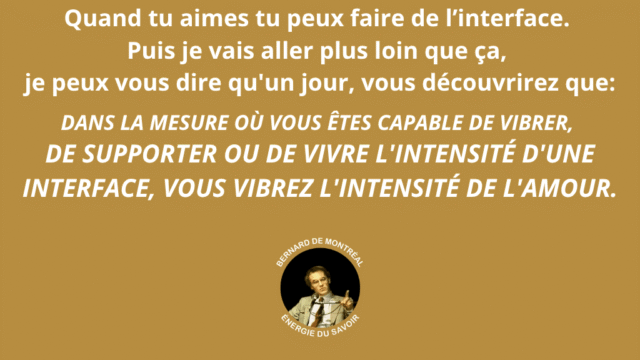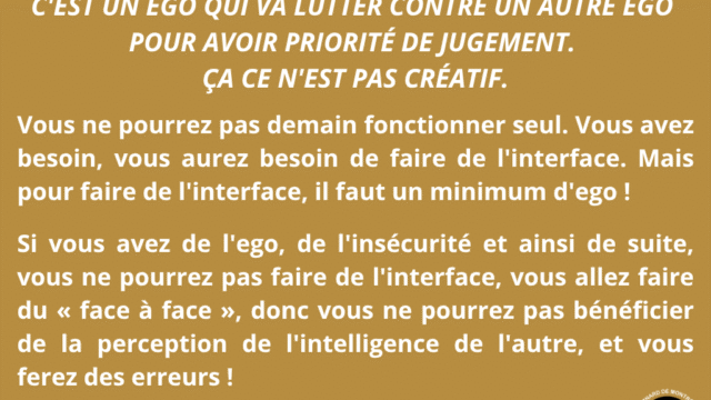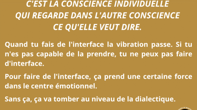 Ce séminaire met en lumière une distinction fondamentale dans les relations humaines : celle entre l’interface et le face à face. Le face à face appartient à l’ego, à ses mécanismes de défense, de comparaison et de pouvoir. Il génère tension, opposition et insécurité. L’interface, au contraire, émerge lorsque l’individu n’est plus centré sur lui-même, mais ouvert à une intelligence commune, capable de créer au-delà des positions personnelles. Ce n’est plus une interaction, mais une co-création.