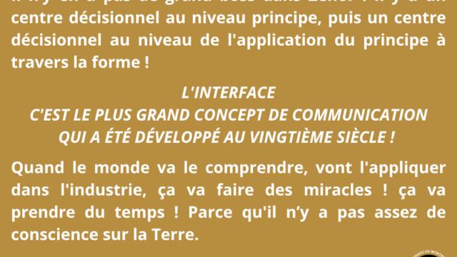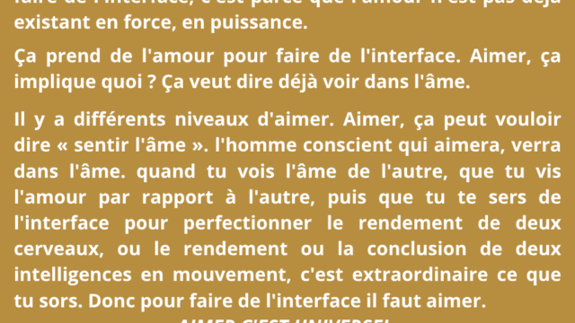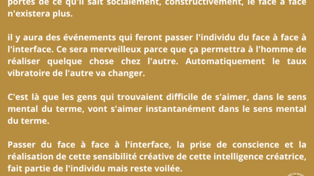 Ainsi, l’évolution mène vers un monde où l’interface remplace le face à face, où les relations ne sont plus des lieux de confrontation mais desespaces d’intelligence partagée, libérés des insécurités de l’ego. L’homme n’y cherche plus à s’imposer, mais à participer à une réalité plus vaste, où la reconnaissance mutuelle des intelligences devient la base même de la vie sociale.