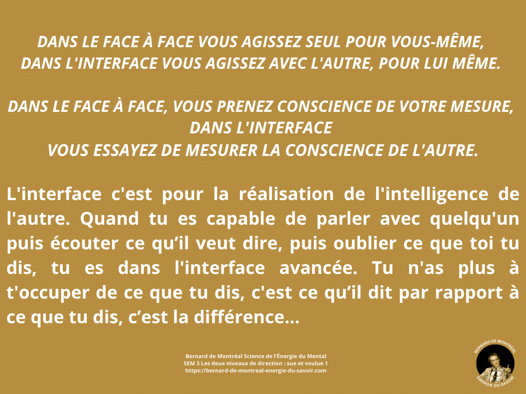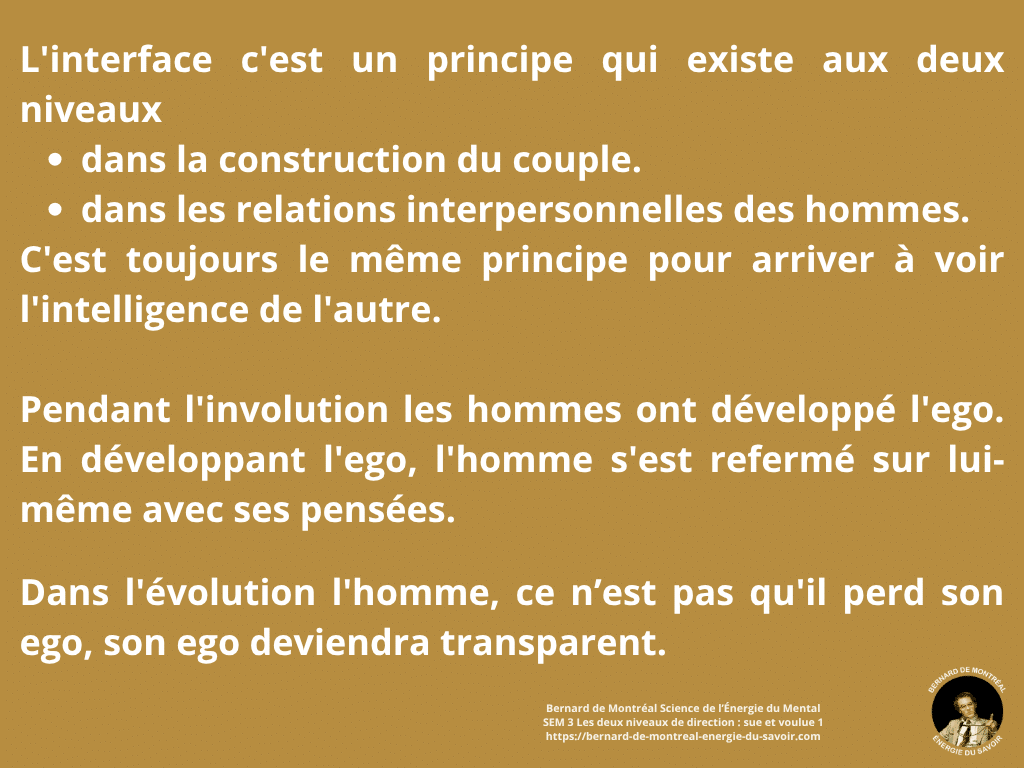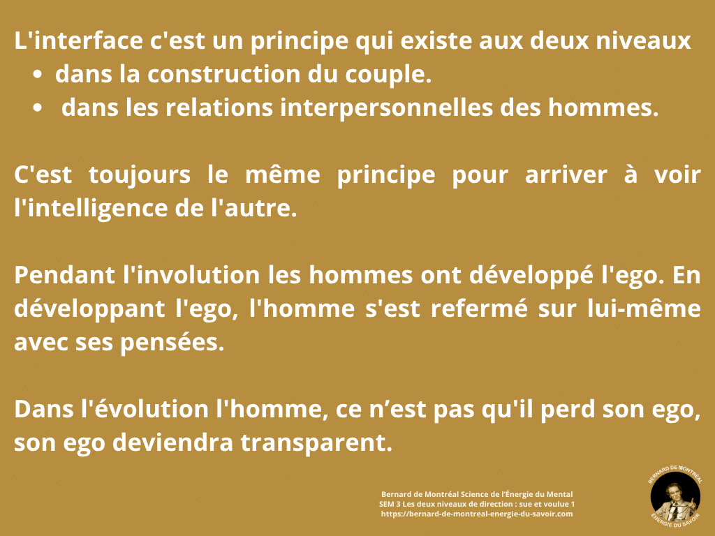 Le principe de l’interface marque le passage de l’éveil individuel à l’intégration réelle de la conscience dans la relation, où l’homme ne se définit plus seul, mais dans une dynamique vivante d’ajustement avec l’autre, permettant à l’énergie du mental de s’ancrer dans la matière.