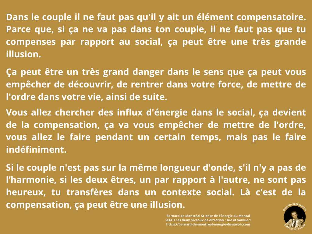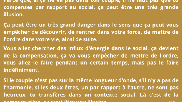 Dans le cadre du couple, cette interface prend une dimension centrale. Le couple n’est pas un refuge affectif, mais un champ d’ajustement permanent, où les déséquilibres internes deviennent visibles. Lorsque l’un compense dans le social ce qui n’est pas équilibré dans la relation, il entre dans une illusion qui fragilise l’ensemble. Le social ne peut corriger ce que le couple ne stabilise pas.