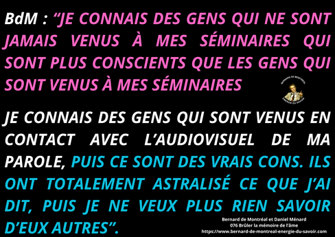 Aujourd’hui, grâce à la mise à disposition publique de tout le matériel audio, chacun peut vérifier par lui-même ce que l’initié fusionné, Bernard de Montréal, a réellement dit — ou n’a pas dit. Ceci permet de dépasser les déviations, dévoiements et interprétations ésotérico-spirituelles, ou intellectuelles, de ceux qui promènent leur public avec leur prétendu savoir, souvent réduit à du plagiat, à du remake, ou à une absence totale d’intégration, de cellularisation de l’énergie de l’instruction... Nous passons sous silence les egos qui utilisent BdeM comme vitrine et vendant très cher des prestations diverses et variés, sans qualifications professionnelles reconnues. Ces dernières étant là pour protéger sans conteste leurs "clients" des dérives astrales.
