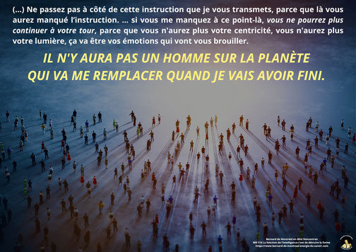 Libérer son esprit c'est le libérer du "messager" pour ne vibrer qu’au "message", sans rien prendre cash, ni au pied de la lettre pour, in fine, s’en libérer également, ne résonnant qu’à sa propre expérience … C'est la clé de voute de l'intégration, de la cellularisation de "l'ensemble de l'œuvre" du premier et dernier initié supramental du siècle moderne, Bernard de Montréal. Les antennes relaies derrière lui, resteront loin, très loin dans l'ombre du projecteur de ce géant satellite, longtemps après le début du prochain cycle...