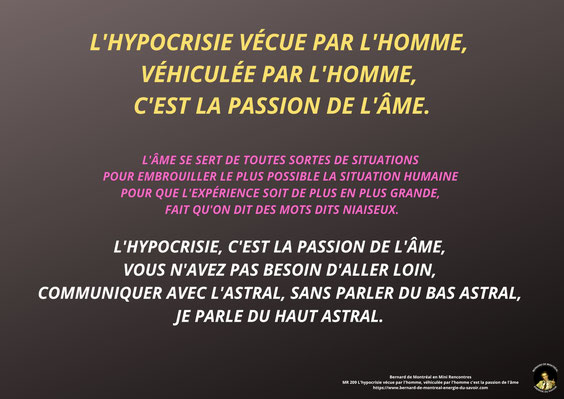 Ceci n'empêchant personne d'écouter les cassettes (dont parle Bernard et non de blocs) autant d'heures d'affilées qu'il le souhaite, quitte à faire une overdose par overtime de blocs, sans reconnaitre le désordre total imposé à cette série, qui avait été auparavant rebaptisée "Révélation Occulte"... pour faire le buzz... MR-209 L'hypocrisie vécue par l'homme, véhiculée par l'homme, c'est la passion de l'âme.