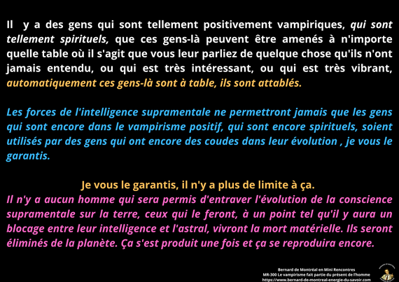 BDM: "L'homme a été vampirisé par l'astral, l'homme ne sera pas vampirisé par l'homme qui n'est pas encore totalement conscient de son vampirisme. (…) Les hommes doivent être amenés un jour à être capables de vérifier par eux-mêmes si telle, ou telle, ou telle personne est authentique parfaitement, parce que c'est sa sécurité". MR 300 le vampirisme fait partie du présent de l'homme