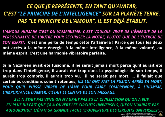 Sa parole vibratoire diffuse "l'énergie de l'Intelligence pure". Il n'est pas un dieu, ni un messie, ni un gourou spirituel... Il est mort en homme et n'a jamais été aussi vibrant que mort ! L'énergie de "sa source" est atemporelle et immortelle, elle ne peut être confondue ni amalgamée au personnage qui a descendu cette énergie de l'Intelligence Universelle sur Terre.